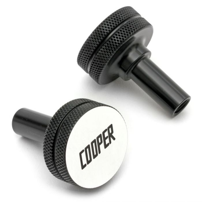Cooper knurled and engraved billet aluminium rocker cover fixing buttons. Anodised in black. Sold as a pair complete with rubbers and washers. A direct replacement for the original rocker cover fixing bolt on any Classic Mini engine.